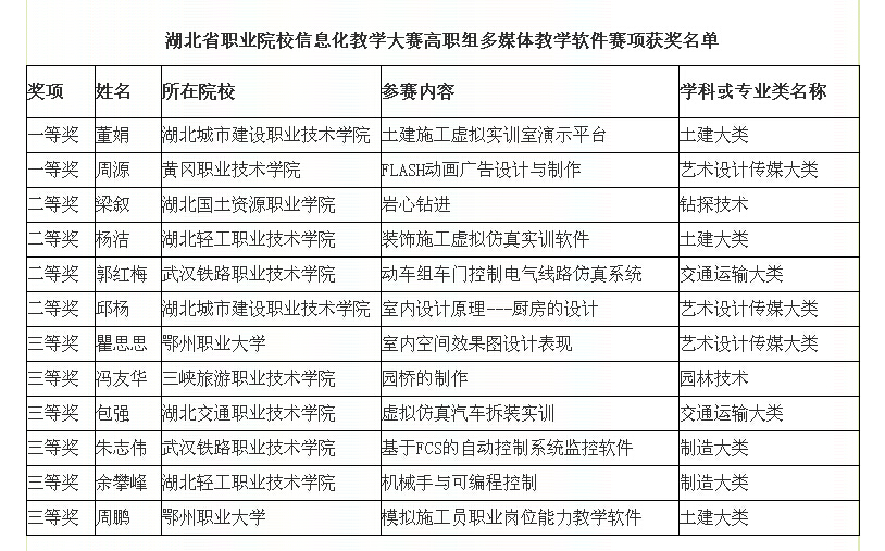 2014年湖北省信息化教学大赛于8月2日-3日在湖北邮电学校顺利举行,我校装饰艺术学院杨洁老师和机电学院余攀峰老师参加了高职组教学软件比赛,分别获得了二、三等奖的佳绩,工商信息学院吴瑞老师参与高职组信息化教学设计比赛,也获三等奖的好成绩。