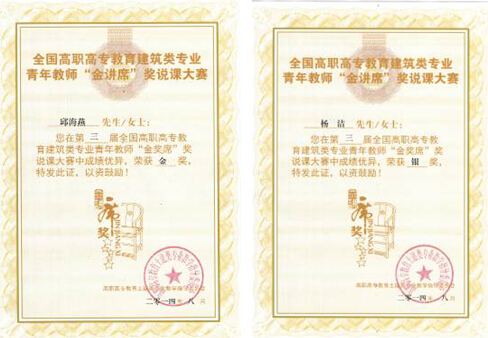 (装饰艺术学院 讯)2014年8月17日第三届全国高职高专教育建筑设计类青年教师“金讲席”奖说课大赛在江苏建筑职业技术学院举行。来自全国四十多所高职院校派代表参加了本次比赛,我院装饰艺术学院派出的邱海燕和杨洁老师,凭借特色鲜明的课程设计、极具感染力的语言和清新的说课风格征服了评委,赢得了一致好评,从参赛选手中脱颖而出,取得了“一金一银”的好成绩。其中,邱海燕老师获建筑装饰专业组金奖,杨洁老师获建筑设计专业组银奖。