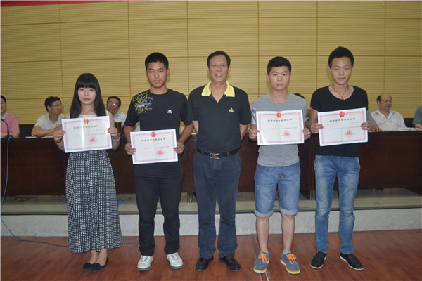 中德啤酒学院总支书记 程汉生、机电工程学院总支书记张建平与获奖学生代表合影