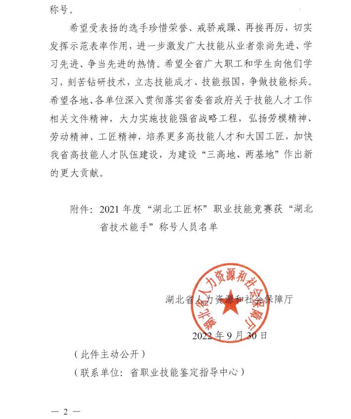 (机电工程学院 付林讯)2022年9月30日,省人社厅发布《关于授予2021年“湖北工匠杯”职业技能竞赛优秀选手“湖北省技术能手”称号的通报》。我校教师张铭、付林获“湖北省技术能手”称号。