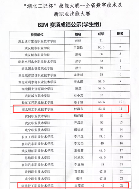 (建筑工程与设计学院 李鲁英讯)2023年3月2日上午,由湖北省人社厅、湖北省教育厅、湖北省总工会、经信厅等联合主办的湖北省第一届职业技能大赛建筑类赛项及全省数字技术及新职业技能大赛BIM赛项在湖北城市建设职业技术学院开幕。来自湖北省内职业院校共有45名同学参加建筑信息模型赛项的比拼。比赛为省级一类赛事。