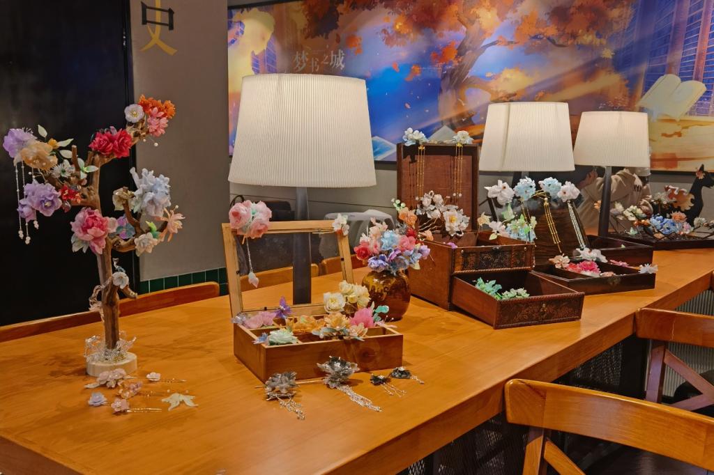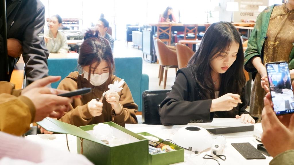 图为会展策划与管理专业学生现场手工制作花簪及动态展示
