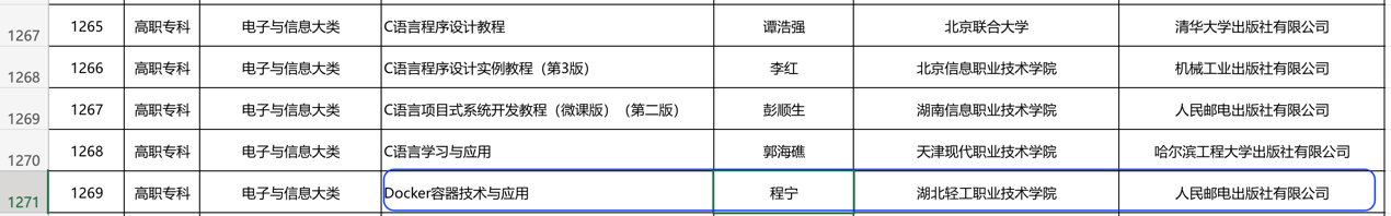(信息工程学院 赵欣讯)2023年5月8日,教育部职业教育与成人教育司发布《关于拟入选首批“十四五”职业教育国家规划教材名单的公示》,经单位申报、形式审查、专项审核、网络和会议评审、专家复核等程序,我校信息工程学院程宁老师主编的教材《Docker容器技术与应用》成功入选首批“十四五”职业教育国家规划教材。