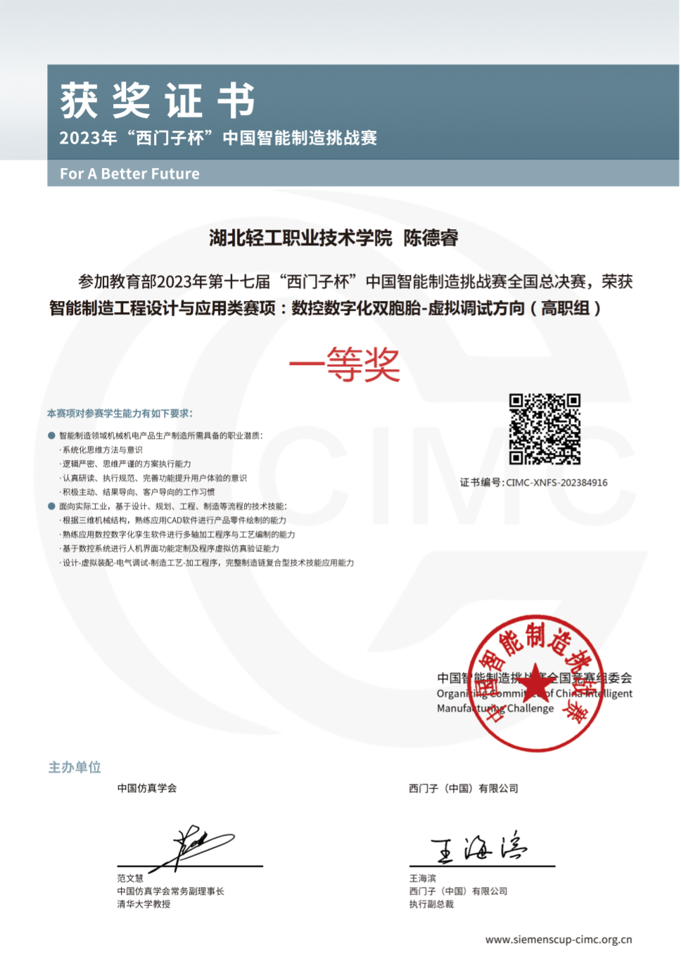 CIMC“西门子杯”中国智能制造挑战赛创办于2006年,是中国智能制造领域规模最大、创办最久的大学生竞赛项目,同时也是教育部中外/中德人文交流机制项目、中国高等教育学会“全国普通高校学科竞赛排行榜”竞赛项目、“全国高校机器人竞赛创新指数”竞赛项目。