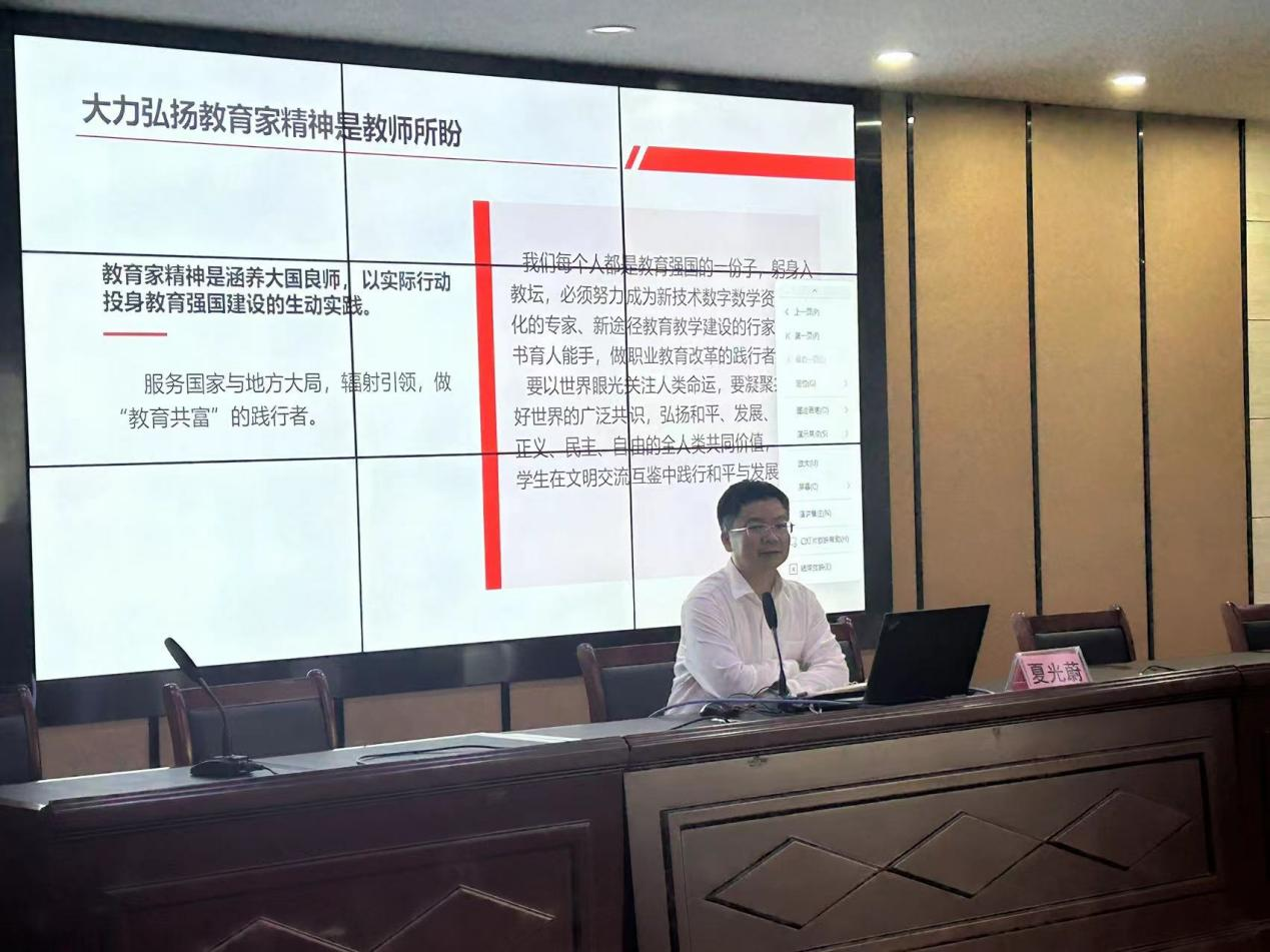 校长夏光蔚结合专题理论学习的要点,勉励广大青年教师坚定理想信念,锤炼专业技能本领,追寻教育家精神,根植教育家情怀,坚守育人初心,担当历史使命,回应时代需求,进一步增强主人翁意识,增强自信力,不断提升自身职业素质与能力。