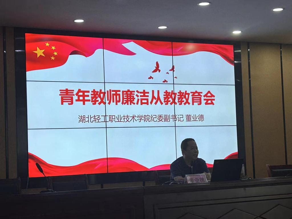 校纪委副书记董业德结合教育部公开曝光的违反教师职业行为十项准则典型案例,分析了当前教师违法违纪的特点,进一步明确青年教师廉洁从教的任务与要求,提出青年教师必须旗帜鲜明地讲政治,强化责任意识,知敬畏,守纪律,守住师德师风底线,担当作为,拼搏努力,为轻工职院发展作出更大的贡献。