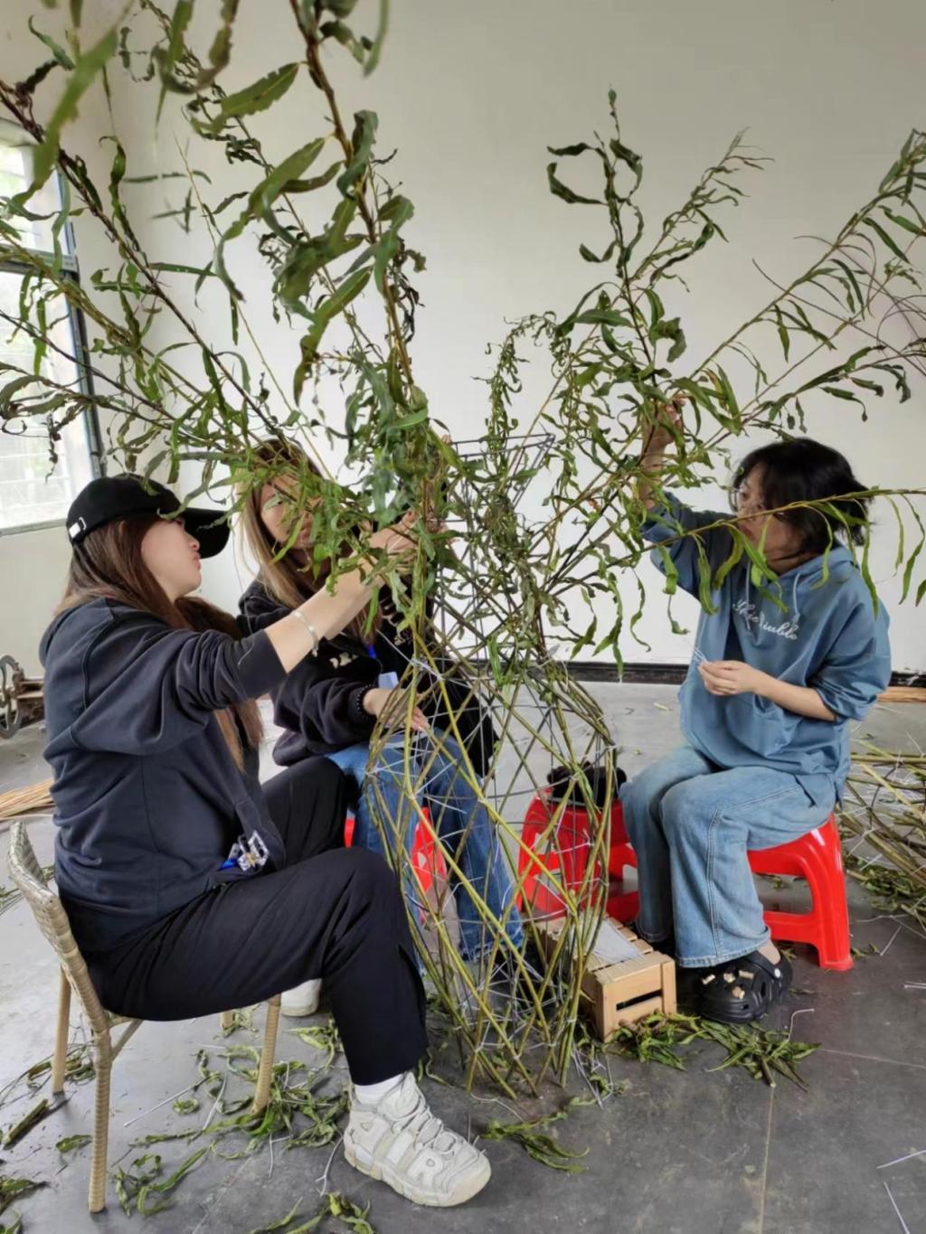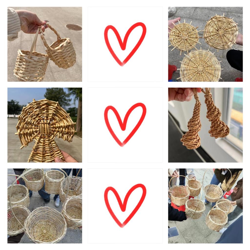在五天的学习中,同学们学习了平编、立编、扭编等基础技法,制作了小篮子、扇子、杯垫等物品,同时亲自参加柳条收割、剥皮等环节,并尝试用柳条进行园艺造型,以小组为单位制作了柳条花篮,种在了柳编基地。