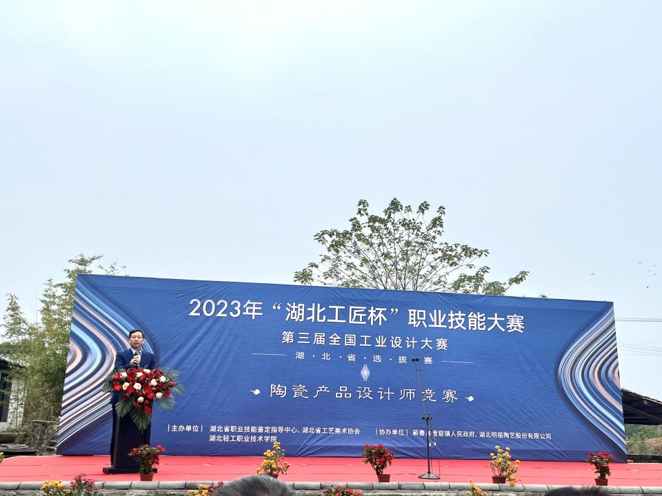 (建筑工程与设计学院 梅傲讯)2023年“湖北工匠杯”职业技能大赛暨第三届全国工业设计大赛陶瓷产品设计师竞赛于2023年11月4日-5日在黄冈市蕲春县官窑柿外桃园成功举办。本次比赛有来自9个单位的17支代表队,分为职工组和学生组两个组别进行同台竞技。11月4日,湖北轻工职业技术学院陈向斌副校长主持了本次开幕式,陈向斌副校长首先介绍了到场嘉宾,出席本次开幕式的嘉宾有:湖北省职业技能鉴定指导中心主任肖平、湖北省工艺美术协会会长范国忠、黄冈市人力资源和社会保障局副局长袁广文 、蕲春县委常委、宣传部长杨振武、湖北省职业技能鉴定指导中心技能竞赛部部长张庆庆及蕲春县管窑镇党委副书记、镇长占镇等,并向全体来宾、领队、裁判和参赛选手的到来表示了热烈的欢迎。
