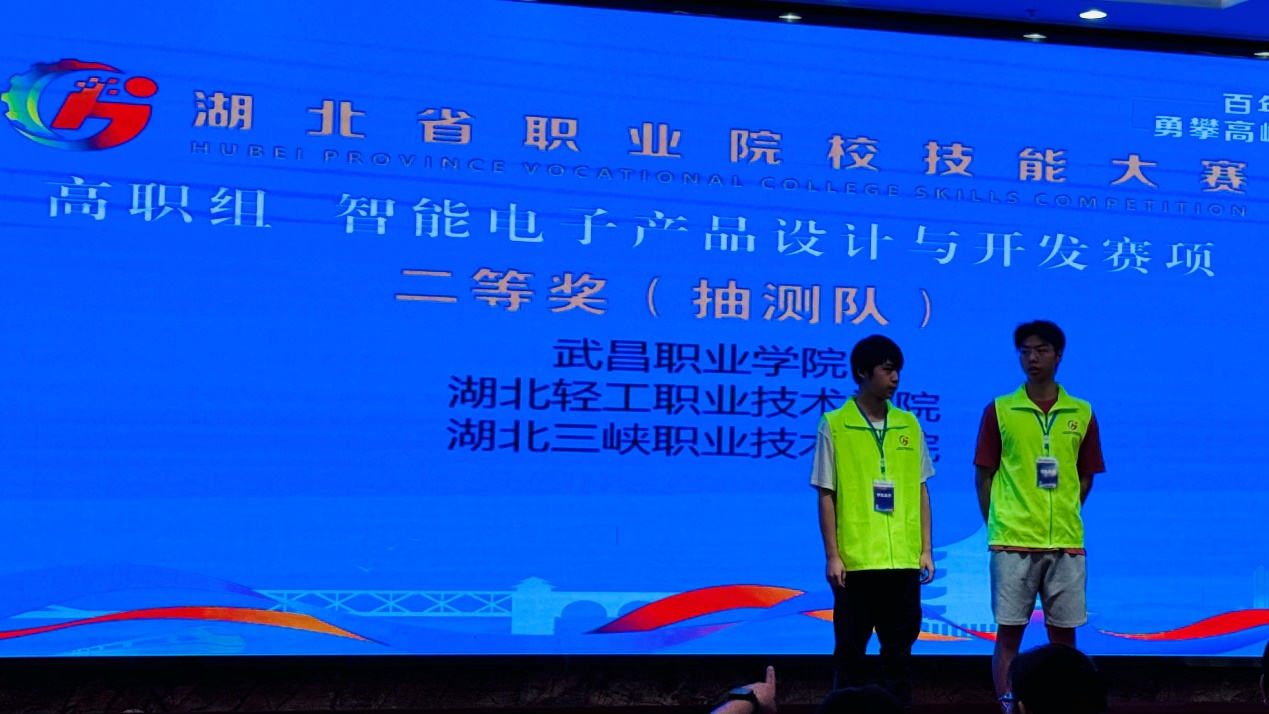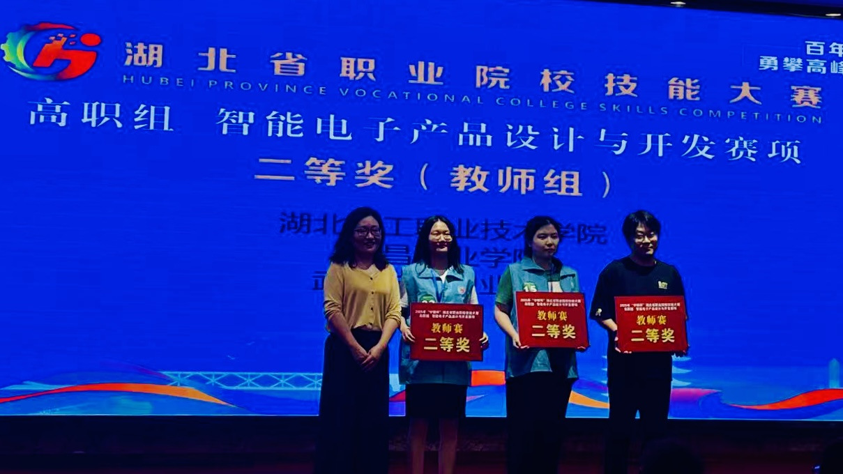 (信息工程学院 杜康讯) 2025年7月6日,湖北省职业院校技能大赛高职组“智能电子产品设计与开发”赛项在武汉船舶职业技术学院圆满落幕。本届赛事汇聚了全省众多职业院校的精英队伍同场竞技,竞争激烈。我校师生凭借扎实过硬的职业技能,双双斩获佳绩,由吴瑞、杜康两位老师指导的23级电信2班周琪、23级电信1班王中伟、24级电信2班江兰梅三位同学组成的抽测队,荣获团体二等奖(第4名);由赵欣、杜康两位老师组成的教师队,斩获团体二等奖(第3名)。我校在此赛项一举收获两项二等奖,充分展现了我校在电子信息类专业领域的深厚实力。
