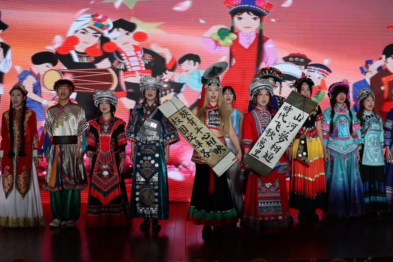 晚会紧扣时代脉搏,校团委大学生合唱团和舞蹈社等各社团精锐尽出,带来了原创舞蹈、集体合唱等一系列高水准节目。特别是民族服装走秀及小品《防诈骗》,将爱国主义教育巧妙融入艺术表达,引发了现场师生的强烈共鸣。这场晚会不仅是一场视听盛宴,更是一堂生动的“大思政课”,充分发挥了校级平台在校园文化建设中的示范引领作用。