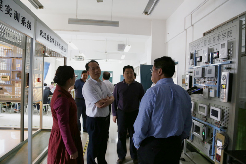 张厅长一行在党委书记方正平、院长徐功瑾、分管教学副院长陈向斌等领导的陪同 下,现场考察了装饰艺术学院的楼宇自动化实训室、智能家居体验馆、数字制作实训室,工商信息学院电信实训室和机电工程学院机械工程实训中心。厅领导在参观了目前处于华中地区领先水平的FESTO柔性自动生产线一体化设备、德国KRONES(太仓)机械有限公司捐赠给我院的七套总价值200多万元的西门子S7300PLC控制系统、由电信专业学生制作并荣获2014年“毕升杯”全国大学生电子创新设计大赛一等奖作品“基于单片机的桌面3D扫描仪系统”后,对我院教学设施建设、师资力量、人才培养等方面工作给予了充分肯定。