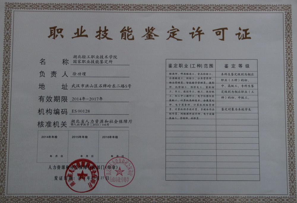 (通讯员冯建波、胡子芬报道)本学期开学伊始,在学院领导及各院系的大力支持下,我院拟成立国家职业技能鉴定所的工作得以顺利开展。2014年3月21日,湖北省职业技能鉴定指导中心邹德洋主任、王延诚部长及两位鉴定专家到我院对申请报告进行实地评估,2014年3月27日正式批文下发,湖北轻工职业技术学院国家职业技能鉴定所宣告成立。这标志着我院在职业技能鉴定范畴的工作从此告别各种乱象,全院在校生的职业技能鉴定工作即将走上统一、健康、可持续发展的道路。湖北轻工职业技术学院国家职业技能鉴定所对全院师生在职业技能学习、考核及证书发放等方面将秉承“最实际、最安全、最优惠”的原则,为我院的职业技能鉴定工作做出贡献!