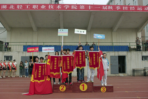 学工处处长祁旭东宣布了获得“运动会道德风尚奖”的班级是:机电工程系13级机电一体化2班,轻化工程系13级食品加工技术班,装饰工程系13级工程监理班,信息工程系13级电信技术班,中德啤酒学院13级酿造机电2班。
