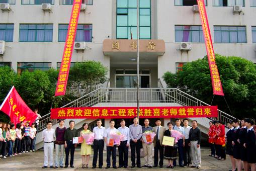2010年5月19日,我院校园内一派喜庆,院领导和师生代表在教学楼前热情迎接参加首届全国高职高专教师教学竞赛的教师们载誉归来。日前,教育部在广州轻工职院组织的首届全国高职高专生物技术类和食品类专业教师教学竞赛中,由我院中德学院、信息工程系、轻化工程系分别选派的选手所组成专业基础、管理类课程综合团队荣获比赛团体一等奖,是湖北省唯一一个团体一等奖。三名获奖教师分别是:一等奖刘光成,二等奖张胜喜和唐艳。