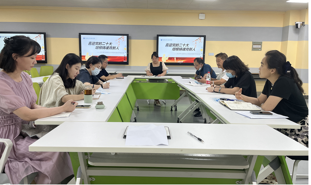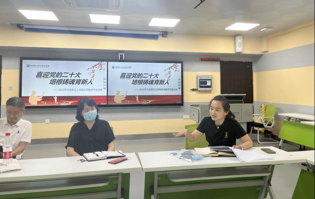 (马克思主义学院 杨雪晴讯)9月8日,在喜迎党的二十大和第38个教师节来临之际,马克思主义学院全体教师在B505智慧教室召开了主题为“迎接党的二十大,培根铸魂育新人”的座谈会。