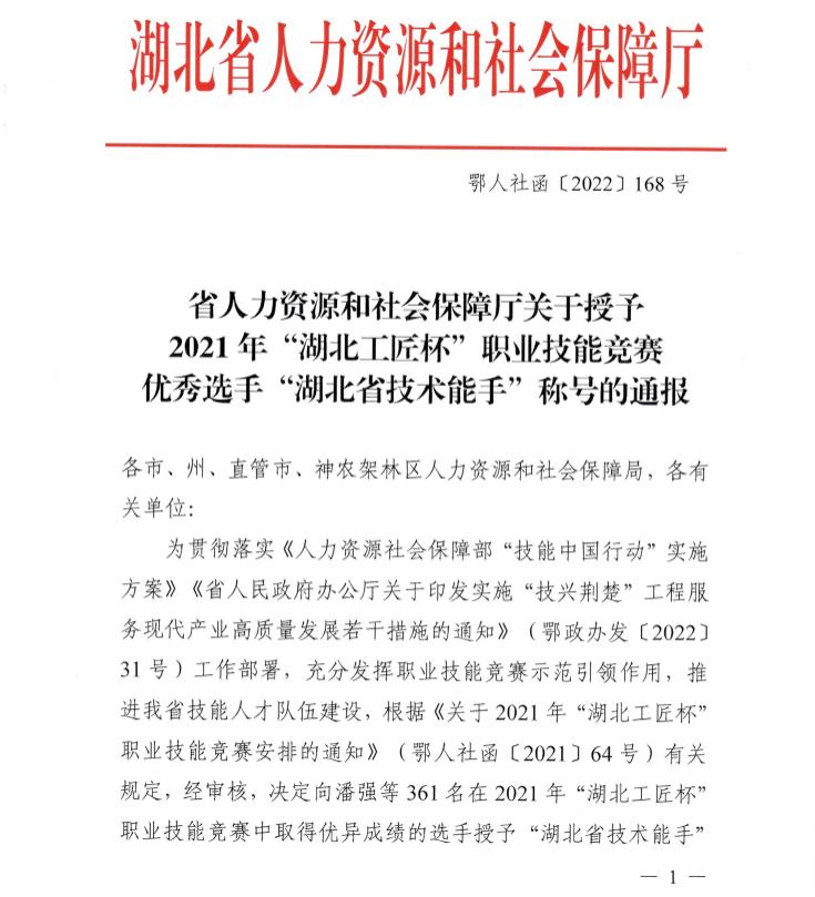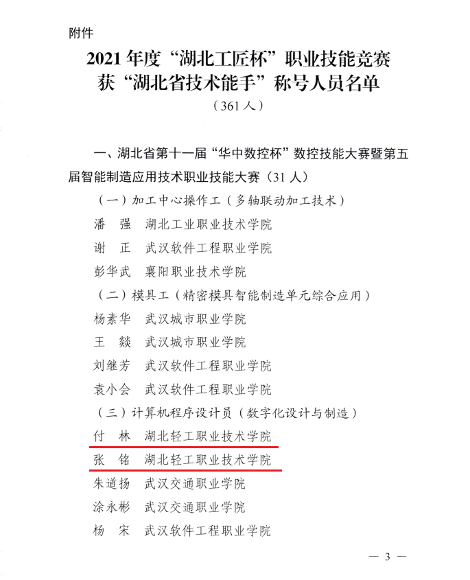 (机电工程学院 付林讯)2022年9月30日,省人社厅发布《关于授予2021年“湖北工匠杯”职业技能竞赛优秀选手“湖北省技术能手”称号的通报》。我校教师张铭、付林获“湖北省技术能手”称号。