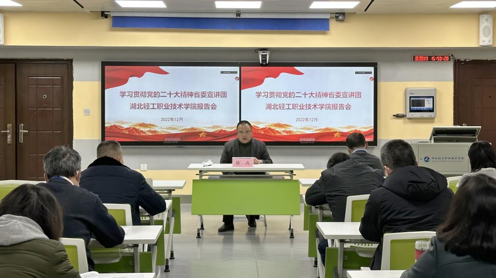 (党委宣传部 严静雅讯)12月1日下午,学习贯彻党的二十大精神湖北省委宣讲团湖北轻工职业技术学院报告会举行,学习贯彻党的二十大精神湖北省委宣讲团成员、华中科技大学马克思主义学院院长岳奎同志宣讲。报告会由我校党委书记、院长徐兵同志主持,以视频形式召开,班子成员和各部门负责人在主会场,各支部设分会场,全体党员干部在云端参加了此次报告会。