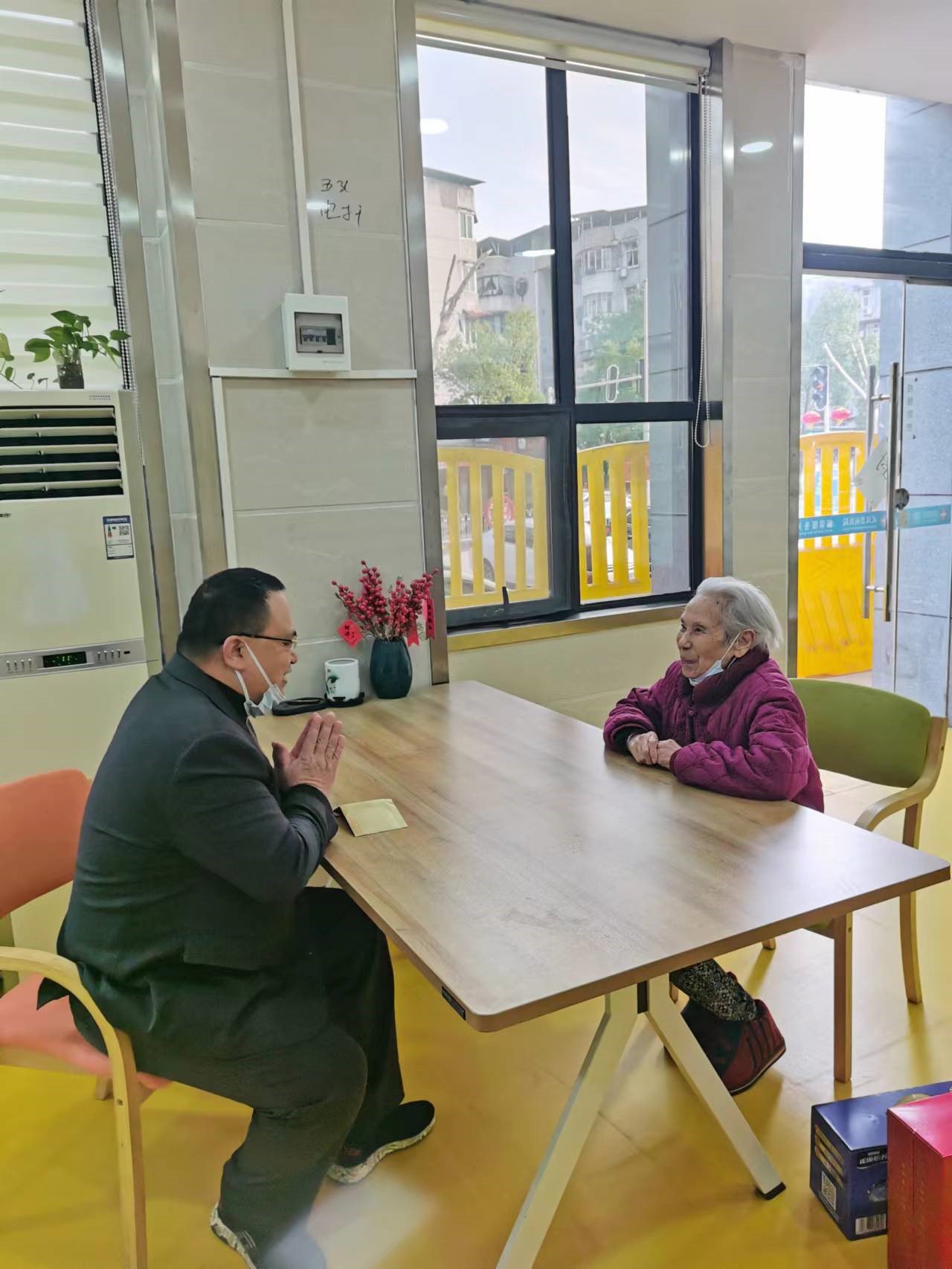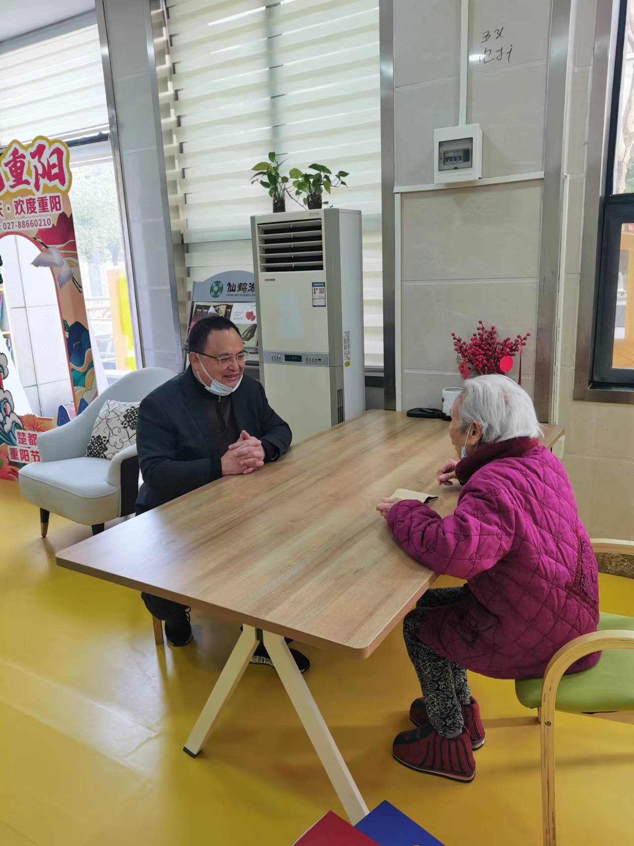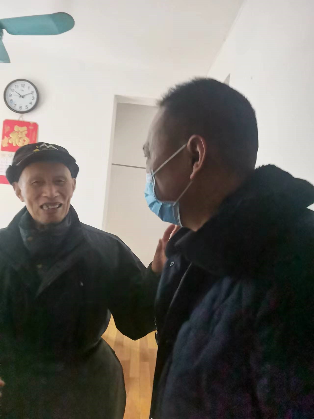 在养老院会客室,徐兵同志拉着离退休老干部马学芬同志的手,亲切询问马老的健康状况和生活起居、精神状态,看到马老精神矍铄、精力充沛感到非常欣慰。