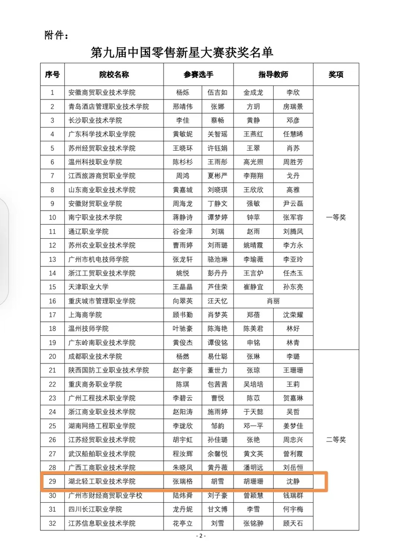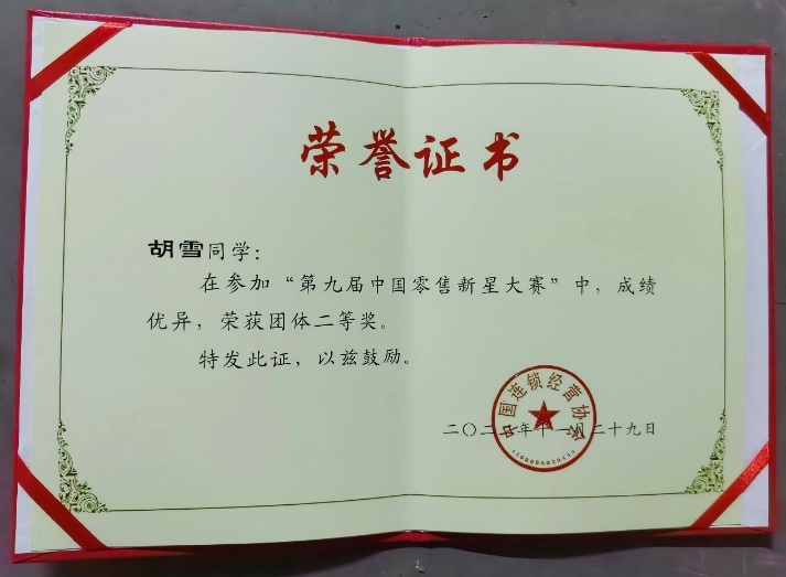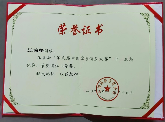 (工商管理学院胡珊珊讯)2022年11月10日,“第九届中国零售新星大赛”落下帷幕。在工商管理学院沈静、胡珊珊老师指导下,我校2021级市场营销专业张瑞格、胡雪两名同学凭借出色的表现,荣获二等奖, 并获得恒欣奖学金。