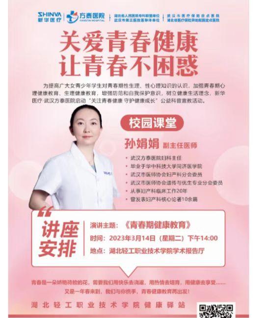 (校医务室 吴芳讯)为弘扬科学精神、普及科学知识,深入开展健康校园行动和爱国卫生运动,进一步帮助女生加深对青春期知识的了解,树立“自尊、自强、自爱、自立”的价值观,增强自我防范、自我保护的意识,3月14日下午,新华医疗集团武汉方泰医院受我校健康驿站邀请为在校女生举办了一场女生健康教育讲座,共有超200名来自各个院系的女生代表参加了本次讲座。