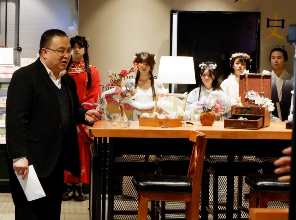 图为会展策划与管理专业学生现场手工制作花簪及动态展示