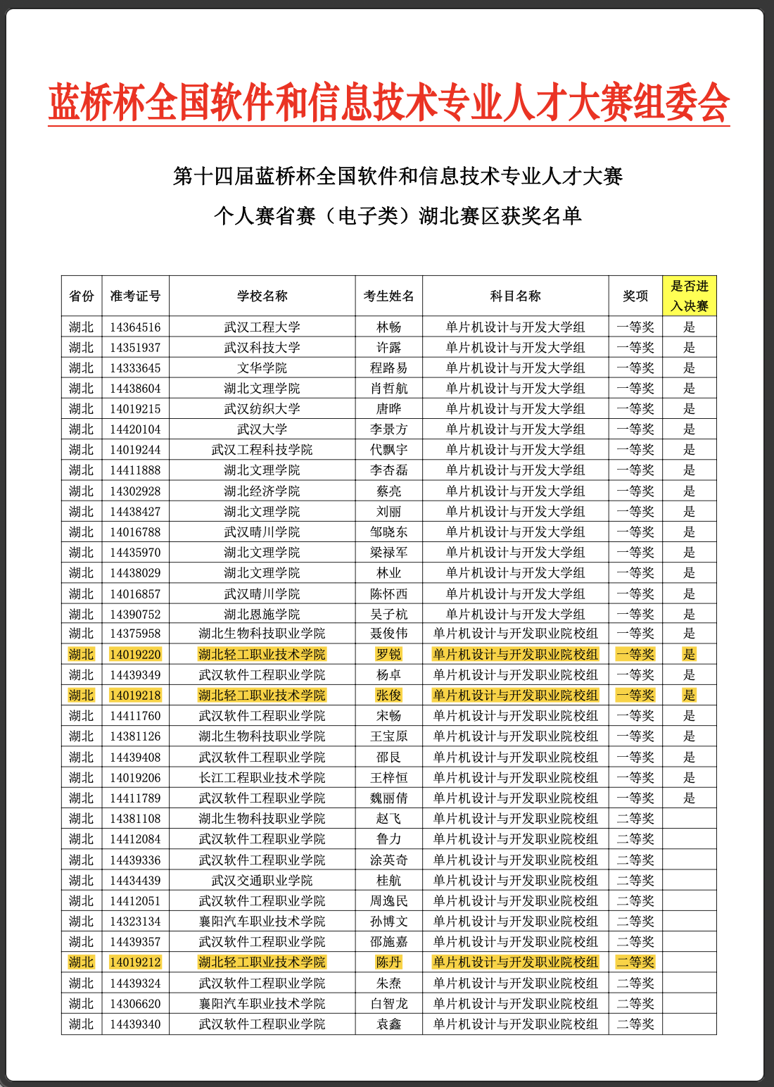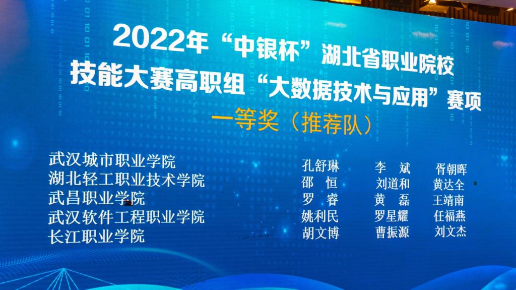 (信息工程学院陈刚 赵欣讯)4月23日,我校信息工程学院学子在2022年“中银杯”湖北省职业院校技能大赛高职组“大数据技术与应用”赛项中勇夺推荐队一等奖,总排名第二名的好成绩。同日,第十四届蓝桥杯大赛省赛个人赛获奖名单公布,我校21级电子信息专业的罗锐、张俊、陈丹同学分别获得两个省级一等奖,一个省级二等奖。