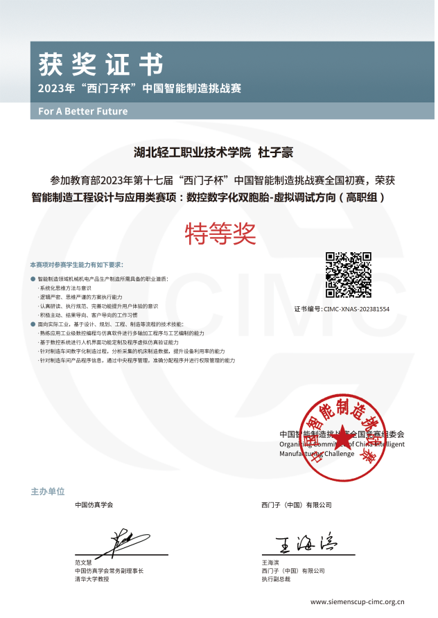 (机电工程学院 刘岑讯)8月15日,第十七届“西门子杯”中国智能制造挑战赛全国总决赛在兰州理工大学落下帷幕。本次总决赛共有来自全国243所高校的523支队伍参加,其中由我校机电工程学院刘岑、付林老师指导的代表队以全国排名第二的总成绩荣获“数控数字化双胞胎——虚拟调试”赛项全国总决赛一等奖,刘岑老师、付林老师也因此荣获“优秀指导教师”称号。