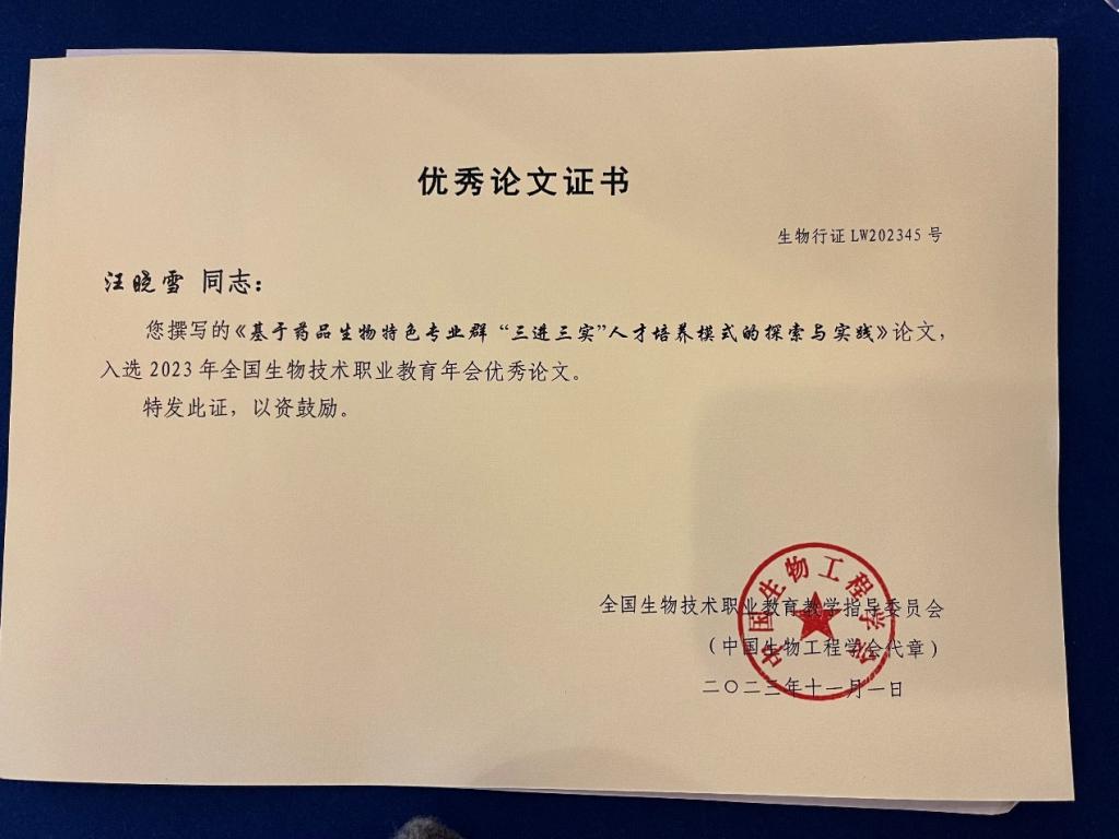 会上还颁发了优秀论文证书,我校基于药品生物特色专业群 “三进三实”人才培养模式的探索与实践入选2023年全国生物技术职业教育年会优秀论文。