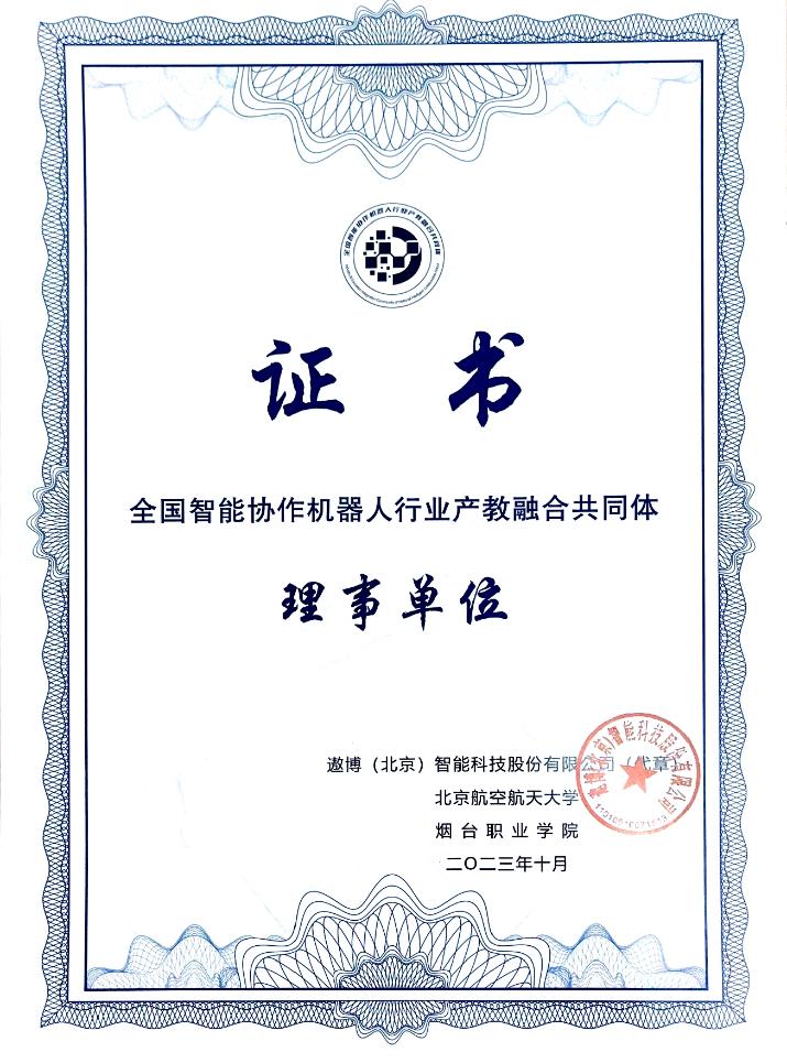图1、全国智能协作机器人行业产教融合共同体理事单位证书