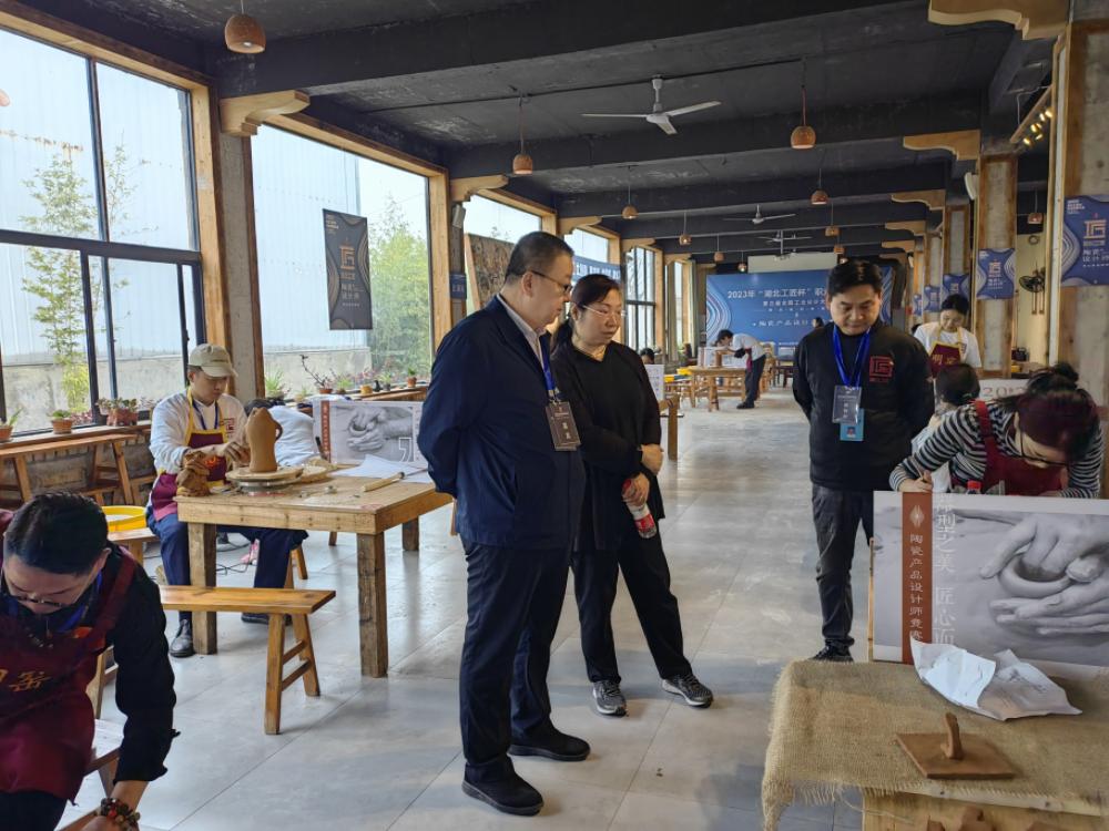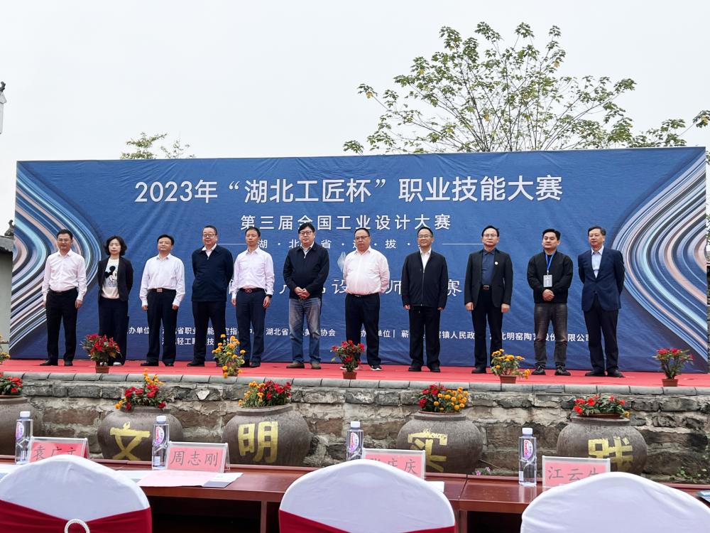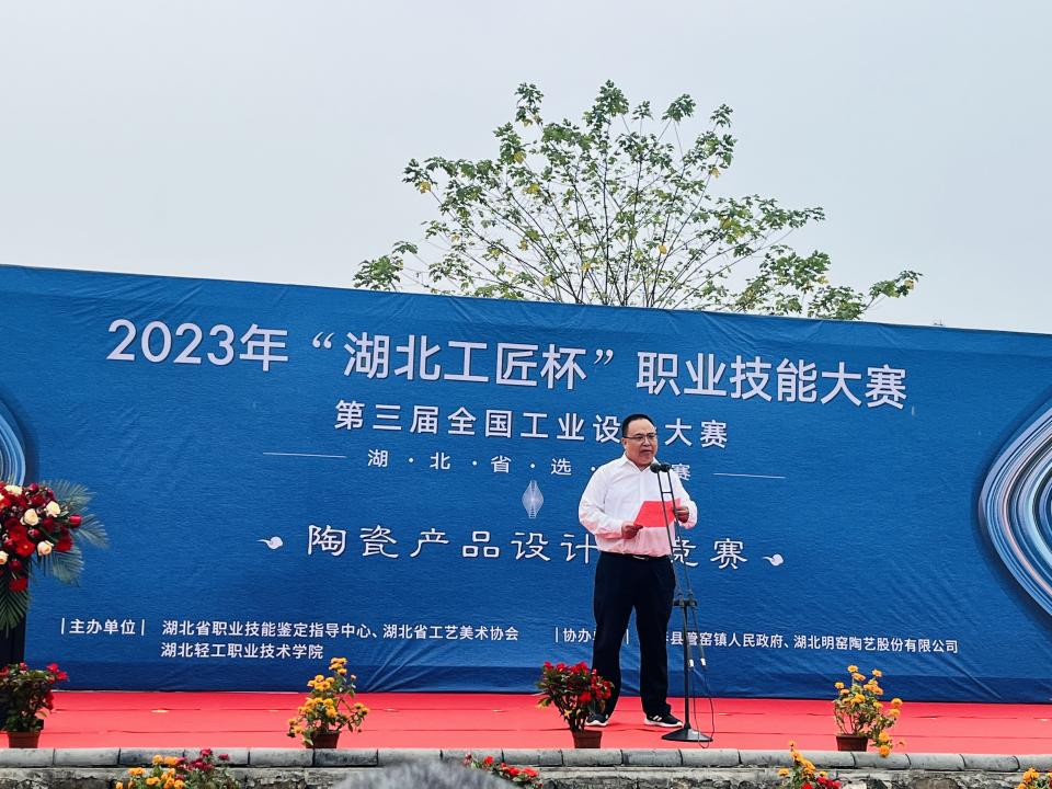 (建筑工程与设计学院 梅傲讯)2023年“湖北工匠杯”职业技能大赛暨第三届全国工业设计大赛陶瓷产品设计师竞赛于2023年11月4日-5日在黄冈市蕲春县官窑柿外桃园成功举办。本次比赛有来自9个单位的17支代表队,分为职工组和学生组两个组别进行同台竞技。11月4日,湖北轻工职业技术学院陈向斌副校长主持了本次开幕式,陈向斌副校长首先介绍了到场嘉宾,出席本次开幕式的嘉宾有:湖北省职业技能鉴定指导中心主任肖平、湖北省工艺美术协会会长范国忠、黄冈市人力资源和社会保障局副局长袁广文 、蕲春县委常委、宣传部长杨振武、湖北省职业技能鉴定指导中心技能竞赛部部长张庆庆及蕲春县管窑镇党委副书记、镇长占镇等,并向全体来宾、领队、裁判和参赛选手的到来表示了热烈的欢迎。