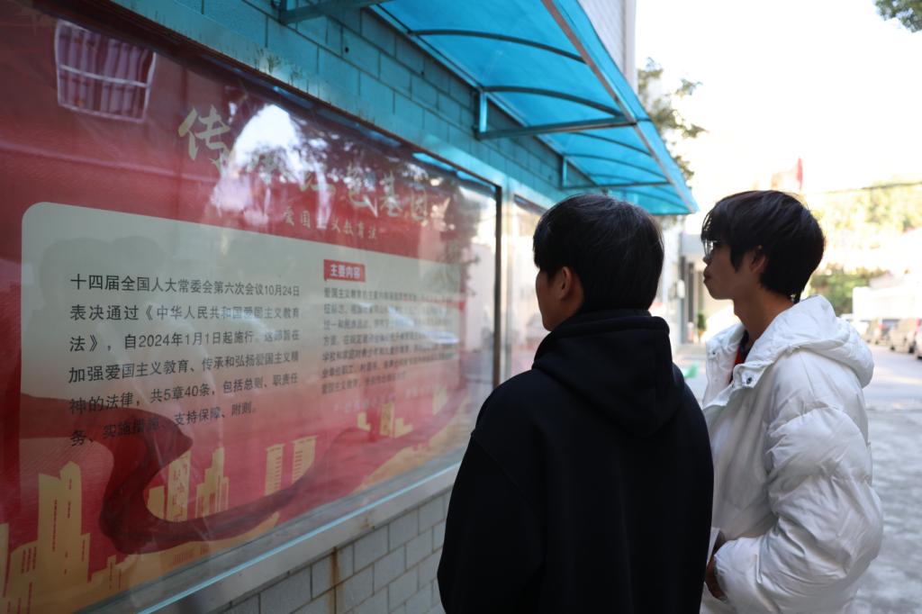 以《中华人民共和国爱国主义教育法》为主题的法治教育专栏吸引了众多学生前往观看。