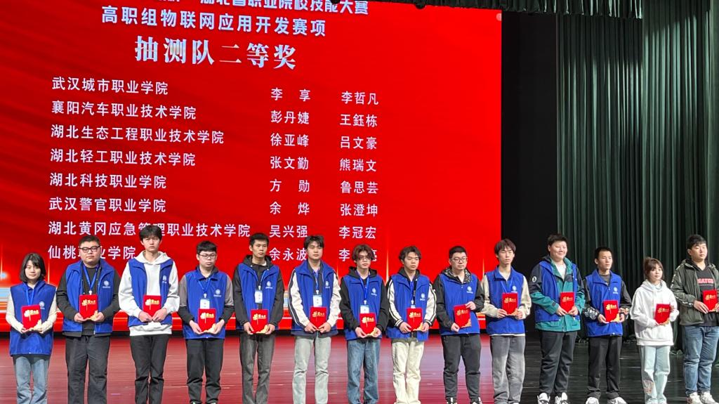 3月22日在物联网应用开发赛项中,22级电子信息工程技术专业方功耀、石铝同学获得推荐队三等奖,张文勤、熊瑞文同学获得抽测队二等奖。