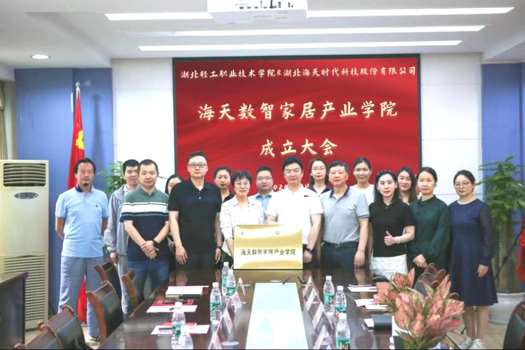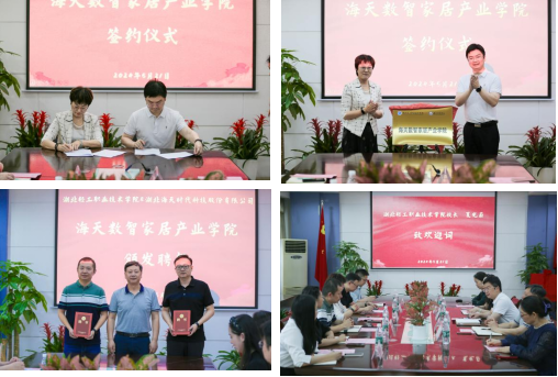 (建筑工程与设计学院 李娟讯)为了深化产教融合,加强校企合作,推动教育链、人才链与产业链、创新链的融合,5月21日,在湖北轻工职业技术学院校会议室召开了与湖北海天时代科技股份有限公司“海天数智家居产业学院”成立大会,并进行签约和挂牌仪式。湖北轻工职业技术学院校长夏光蔚、副校长陈向斌,建筑工程与设计学院院长杨洁、建筑工程与设计学院副院长李国芳、建筑工程与设计学院装饰教研室主任李娟及建筑装饰专业教师参会。