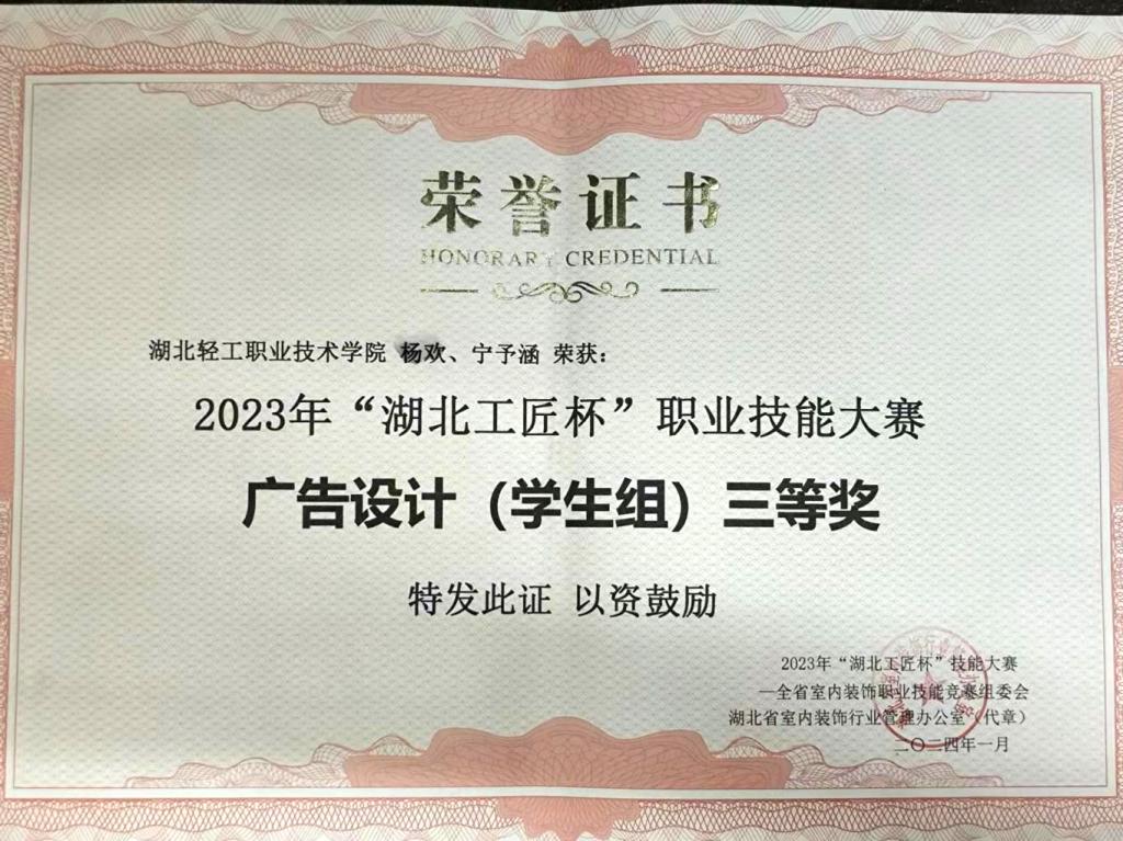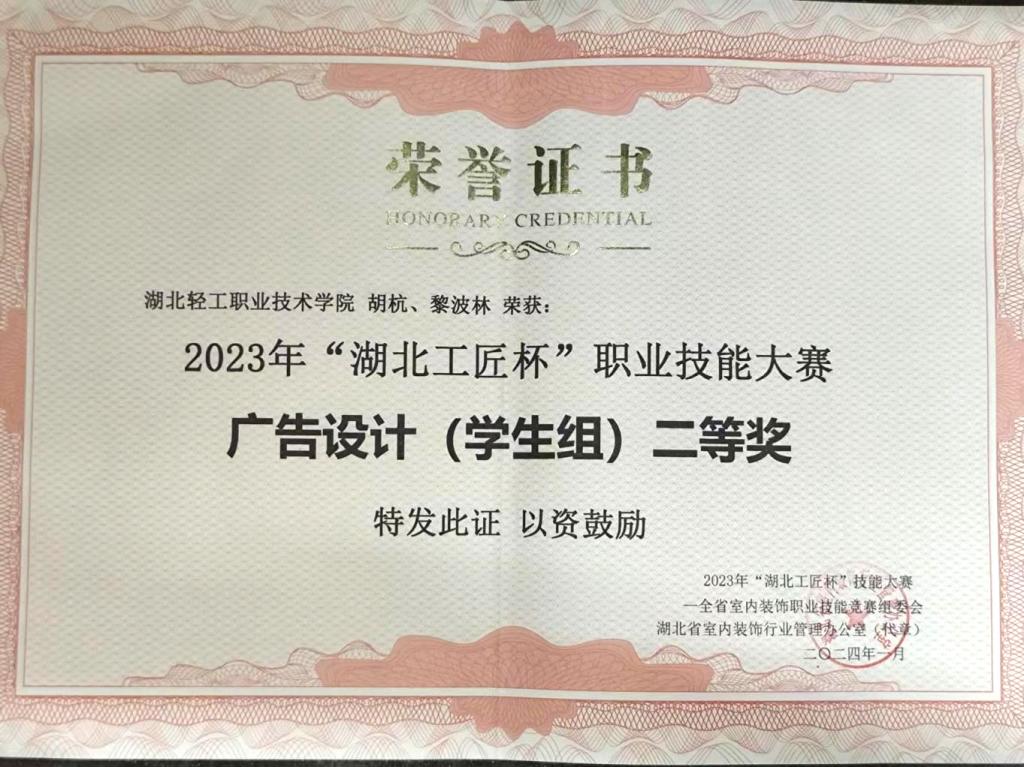 (建筑工程与设计学院 会展一班陈可讯)在近日落幕的2023年“湖北工匠杯”职业技能大赛中,湖北轻工职业技术学院会展策划与管理专业学生凭借其在专业领域的独特优势,赢得了全省室内装饰职业技能竞赛广告设计(学生组)奖项,为学院赢得了荣誉。其中,胡杭、黎波林同学荣获二等奖,陈可、余晶雅等五名同学荣获三等奖。这不仅是对参赛学生专业技能的认可,更是对他们个人意志和创意能力的肯定。