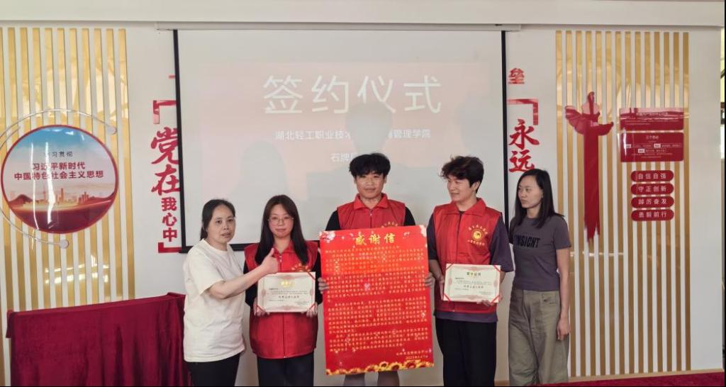 (工商管理学院 王冰姿)5月12日,湖北轻工职业技术学院工商管理学院学生党支部与石牌园社区正式签订校社共建协议,双方在党建引领、志愿服务、资源共享等领域的合作迈入新阶段。签约仪式上,石牌园社区李书记向工商管理学院学生党支部颁发荣誉证书,并献上一封情真意切的感谢信,充分肯定学生志愿者为社区治理作出的积极贡献。