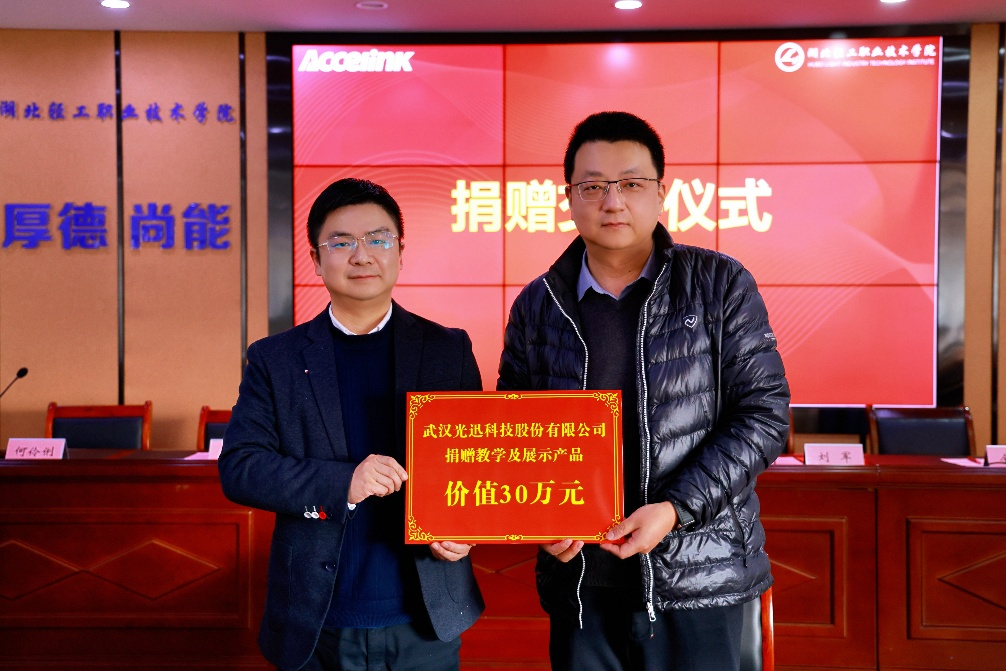 (信息工程工程学院 何伶俐讯)1月14日,武汉光迅科技股份有限公司向湖北轻工职业技术学院捐赠仪式在学校六楼会议室举行。光迅科技供应链管理部副总经理刘军、运作管理部经理余强、人力资源专员郭耀中、人力资源实习生李宛姿(23级集成电路技术班学生),湖北轻工职业技术学院党委副书记、院长夏光蔚,信息工程学院牵头负责人赵欣、副书记王毅,集成电路教研室主任何伶俐、专业带头人于海燕及专任教师代表杜康、徐梦龙、苏小默等参加了此次活动。