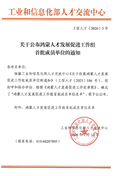 (信息工程学院 陈刚讯)2026年1月13日,工业和信息化部人才交流中心正式公布鸿蒙人才发展促进工作组首批成员单位名单。我校凭借在信息技术领域深厚的教学积淀、扎实的产教融合实践基础及对国产操作系统人才培养的前瞻布局,经严格初审与综合评估,成功入选首批成员单位,与政府机构、华为等行业龙头企业及顶尖高校并肩,跻身鸿蒙人才生态建设核心阵营,以职业教育标杆姿态助力国家科技自立自强战略落地。