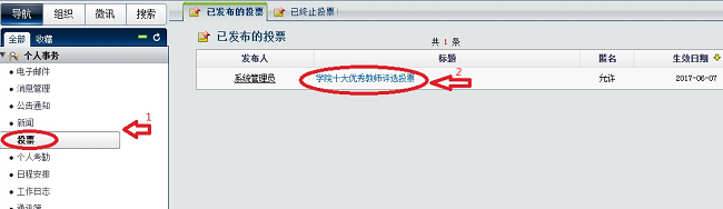 进入学校主页:www.hbliti.com,输入帐号密码登录办公系统,展开“个人事务”,点击投票,如下图所示。(备注:该方式只限办公系统用户,每用户投一次,一次最多投10人)