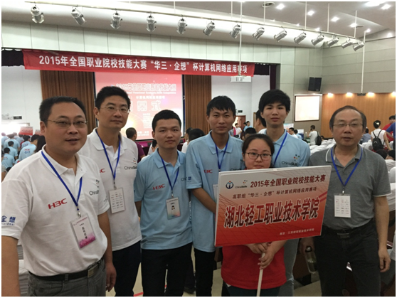 (工商信息学院 戴远泉讯)2015年6月18—20日,“2015年全国职业院校技能大赛”高职组“华三企想”杯计算机网络应用赛项在江苏财贸职业技术学院举行,我院派出以工商信息学院戴远泉副院长为领队,程宁、邱文军为指导老师,韩昕、方毅然、汪攀3名同学组成的湖北第一代表队,与来自全国31个省市共81支队伍同台竞技。经过奋力拼搏,我院荣获团体三等奖。