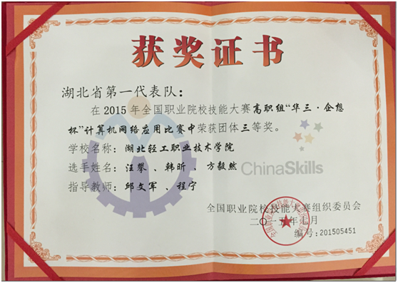 我院荣获“2015年全国职业院校技能大赛”高职组“华三.企想”杯计算机网络应用赛项三等奖