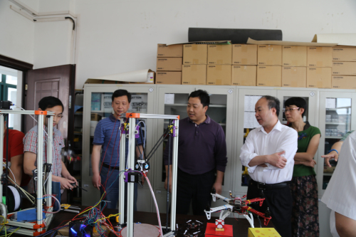 张厅长一行在党委书记方正平、院长徐功瑾、分管教学副院长陈向斌等领导的陪同 下,现场考察了装饰艺术学院的楼宇自动化实训室、智能家居体验馆、数字制作实训室,工商信息学院电信实训室和机电工程学院机械工程实训中心。厅领导在参观了目前处于华中地区领先水平的FESTO柔性自动生产线一体化设备、德国KRONES(太仓)机械有限公司捐赠给我院的七套总价值200多万元的西门子S7300PLC控制系统、由电信专业学生制作并荣获2014年“毕升杯”全国大学生电子创新设计大赛一等奖作品“基于单片机的桌面3D扫描仪系统”后,对我院教学设施建设、师资力量、人才培养等方面工作给予了充分肯定。