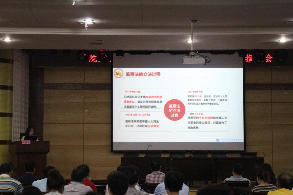 会议邀请我院思政教研室主任周菲菲同志为全体与会人员做了《中华人民共和国监察法》学习辅导报告,辅导报告从立法背景、立法过程与指导思想、主要内容等三个方面对《监察法》进行了详细解析;会议还组织全体党员和中层副职以上的干部观看了湖北省正风反腐纪实警示教育记录片《不忘初心,警钟长鸣》。