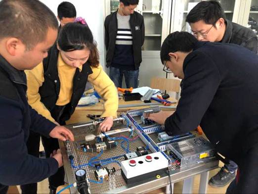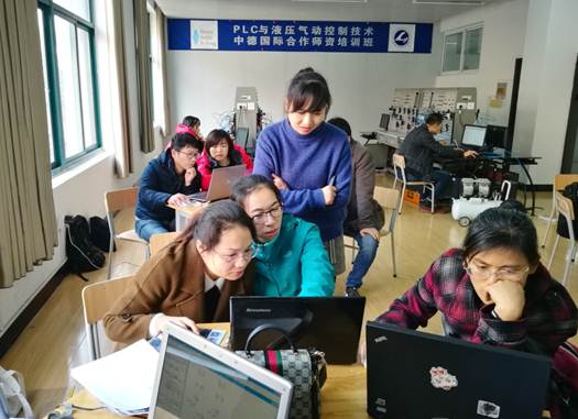培训期间,我校机电工程学院4名专业骨干教师担任了授课任务,这四名教师曾在第一期师训班中以优异成绩结业,她们借鉴德国先进的教学理念和教学方法,并从我国的实际教学需求出发,将德国教学模式应用到此次培训教学中。培训采用了项目式教学模式,理实一体,讲练结合。培训内容包括了气动技术原理和组成、气动控制回路设计和网孔板搭建多缸顺序动作等。参训教师们十分珍惜此次师训机会,明确任务,积极动手,合作交流,成效突出,课堂学习氛围十分浓厚。