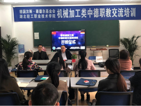 3月18日上午9:00时,“机械加工类中德职教交流培训班”开班仪式在我校机电工程实训中心会议室举行,湖北轻工职业技术学院校长徐兵、机电工程学院院长张恕出席了开班仪式。本次培训吸引了湖北省内9所职业院校的12名机械专业教师参加,两名就读职业教育研究专业的华中师范大学研究生慕名前来参加了培训。