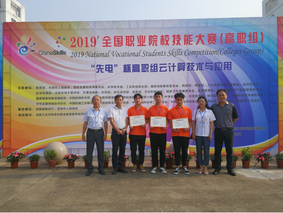 (信息工程学院 黄静讯)  2019年6月1日至2日,全国职业院校技能大赛(高职组)“先电杯”云计算技术与应用赛项在安徽省芜湖市安徽机电职业技术学院成功举办。本届赛事共有全国30多个省市、自治区的103所高职院校参赛。赛前为取得优异成绩,赛出水准,我校信息工程学院党总支书记戴远泉老师院长程宁老师计算机教研室黄静老师,带领高佳航(16网络2班)、唐彪(16计管班)和李义涵(17网络2班)三位参赛队员和其他8名备赛队员在实验室挑灯夜战,刻苦钻研,奋战了90多个日夜,最终在全国赛场取得佳绩,喜获国三等奖。
