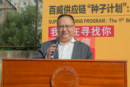 开班仪式开始,首先由徐兵致辞,他回顾了多年来我校与百威集团的合作,我校部分优秀毕业生已经在百威集团走到了中高层领导岗位,他们是我校的骄傲,也是后继学子的引领者。为了与百威进行更深层次的合作,今年分别在中德啤酒学院和机电工程学院开办了三个百威班,更加专业、系统地培养我们的学生,徐兵院长在致辞中对首届百威班的学生殷切寄语,希望大家认真学习知识,刻苦钻研技术,以锲而不舍的精神,圆满完成学习任务,争取为企业的发展贡献更大的力量。