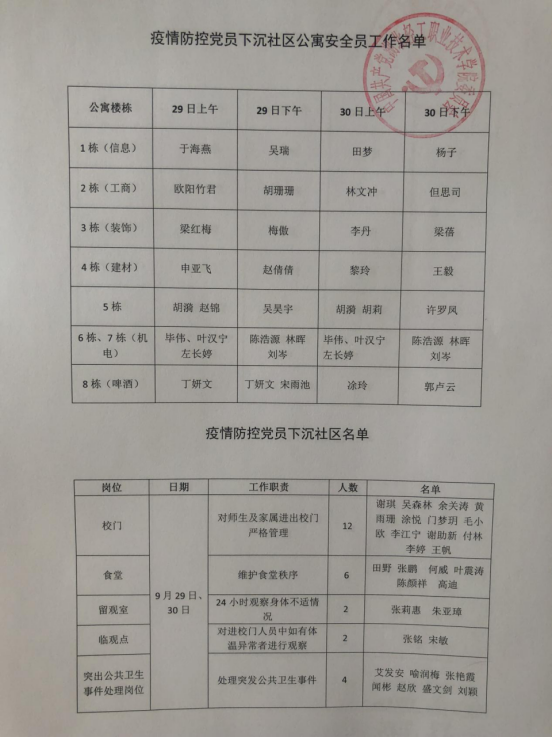 本次党员下沉社区活动共58名党员干部参与,根据学院返校工作需求,划分为校门、食堂、留观室、临观点、突出公共卫生事件处理岗位、学生宿舍楼6个值勤工作组,协助学院学工、后勤、保卫等部门做好体温检测、入校登记等工作。