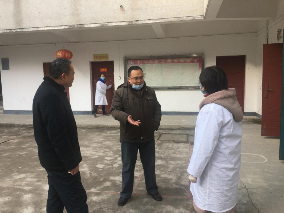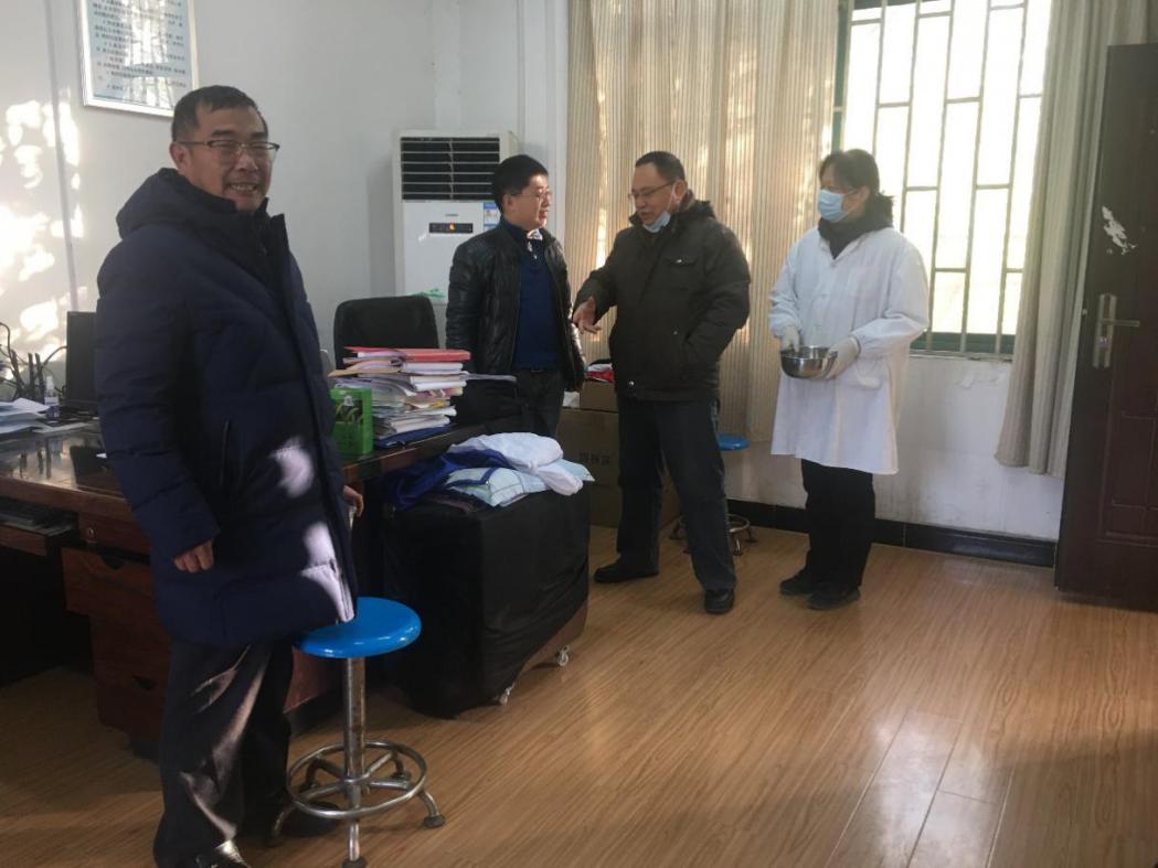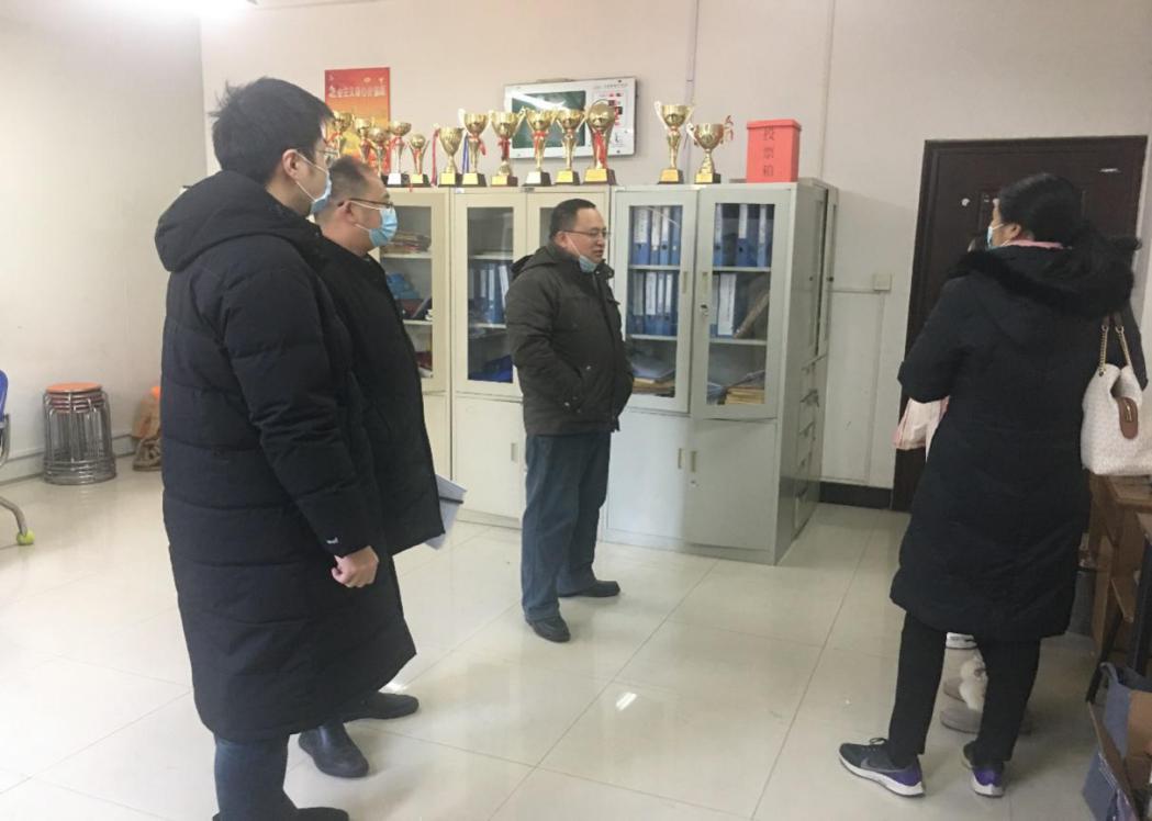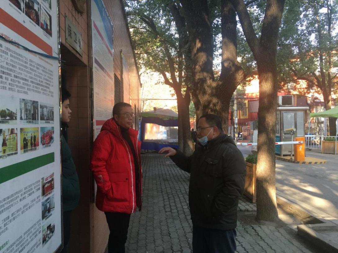 图为徐兵同志(中)在退休办和医务室了解老同志和学生的健康状况