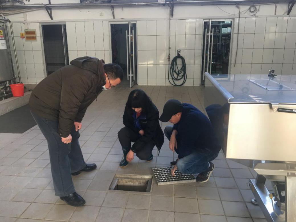 图为徐兵同志(左一)在啤酒实训车间了解生产废水排放问题