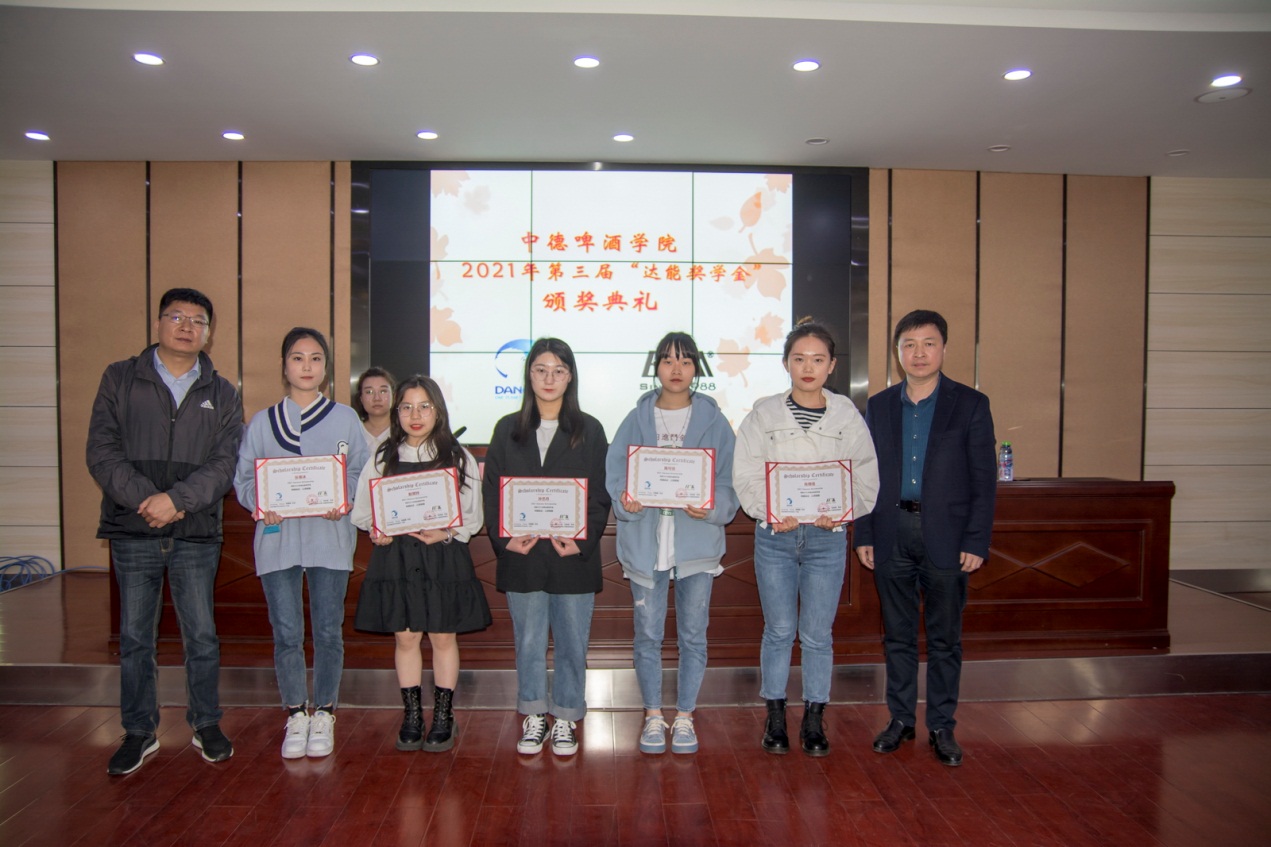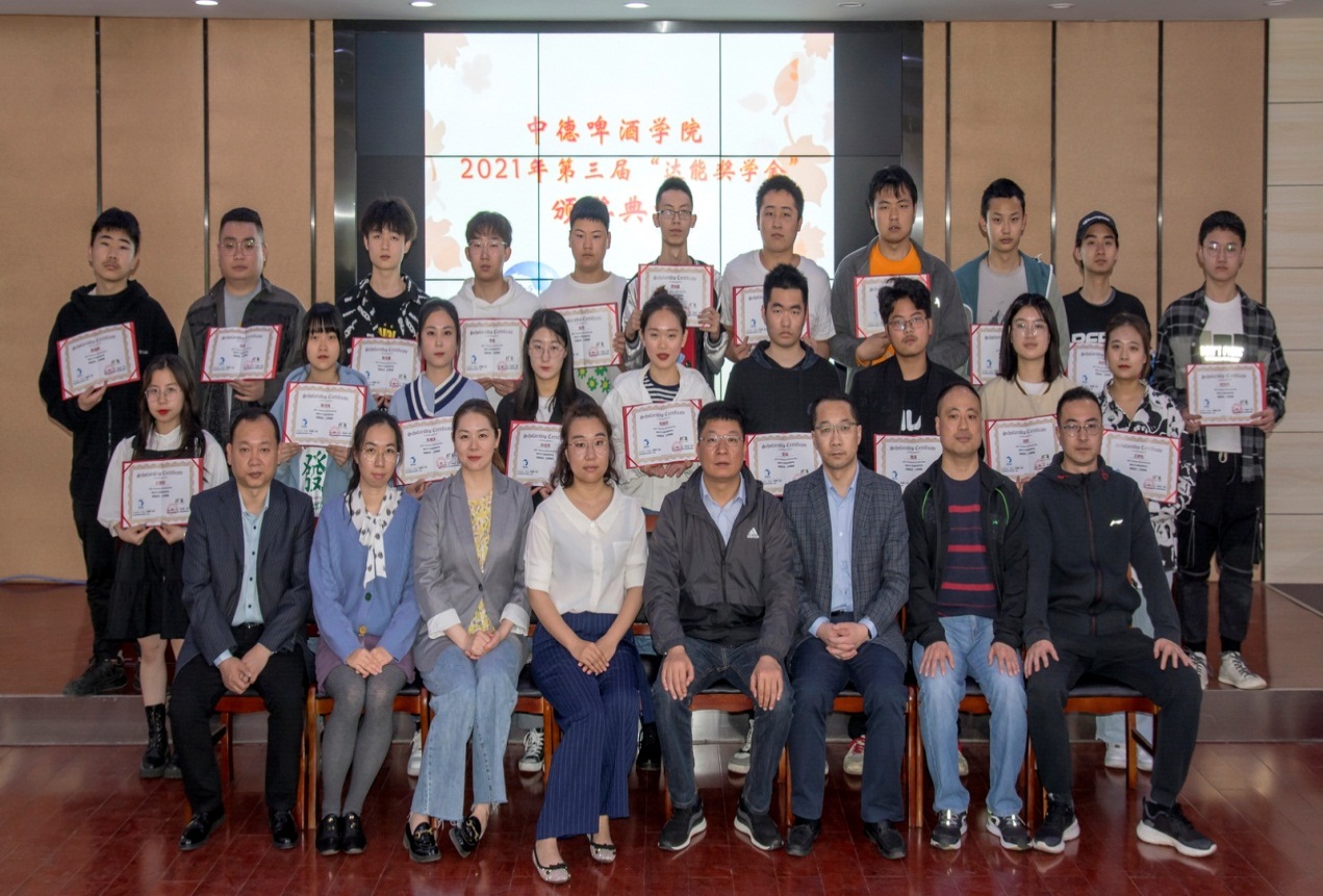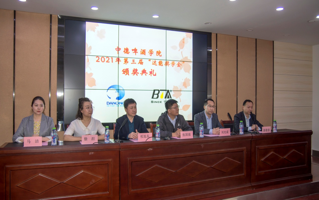 (中德啤酒学院 尹宇讯) 2021年4月23日上午10点,中德啤酒学院第三届“达能”奖学金颁奖典礼在六楼会议室隆重举行。达能中国饮料华中区域工厂总监张国强先生、达能中国饮料武汉工厂人力资源经理徐汨女士、湖北轻工职业技术学院院长助理祁旭东老师、中德啤酒学院院长刘光成老师、党总支副书记陈敬春老师、副院长马洁老师、饮料加工教研室主任刘勋老师及班主任凃玲老师及“达能”班全体同学参加了颁奖典礼,典礼由辅导员尹宇老师主持。